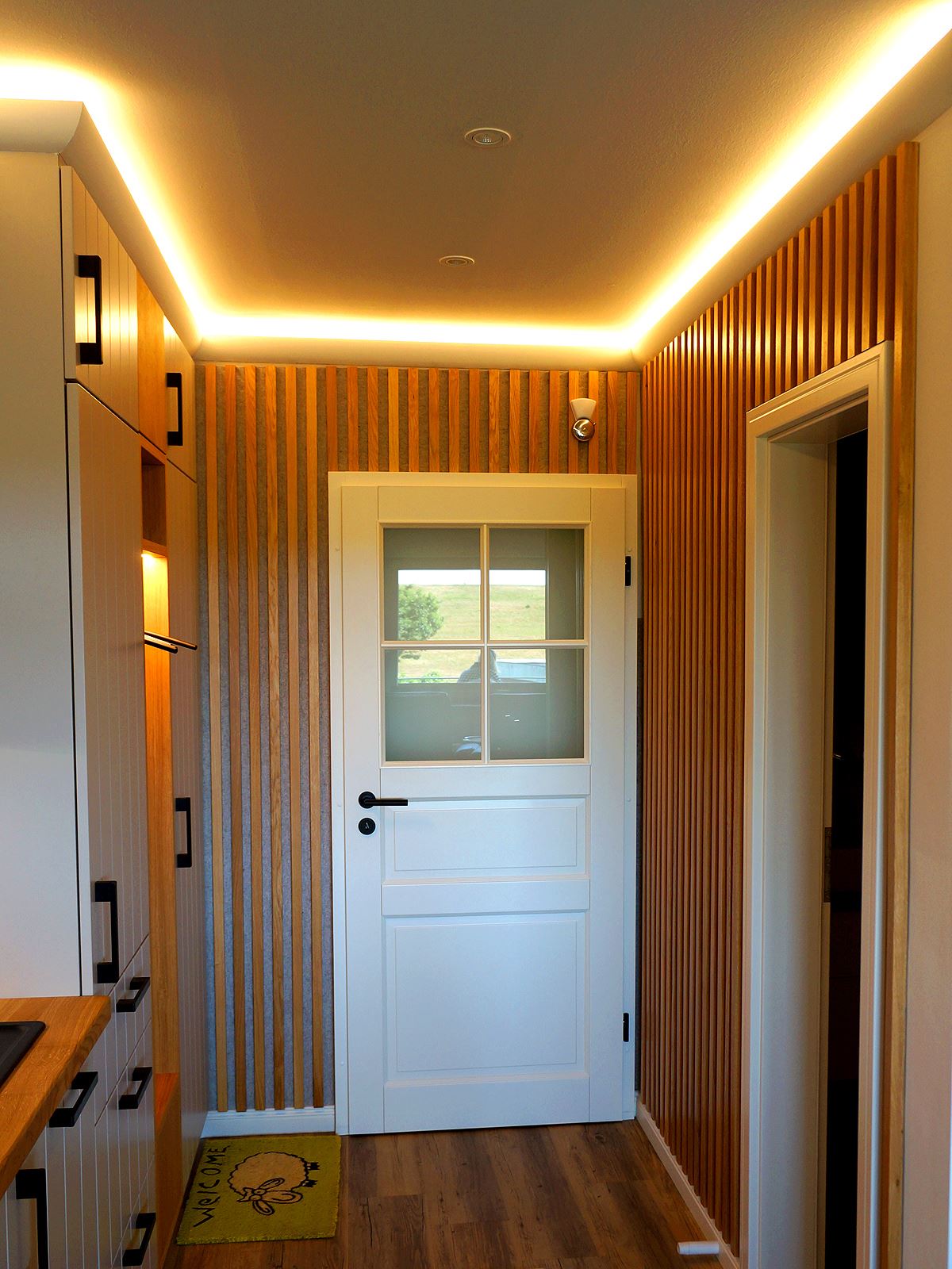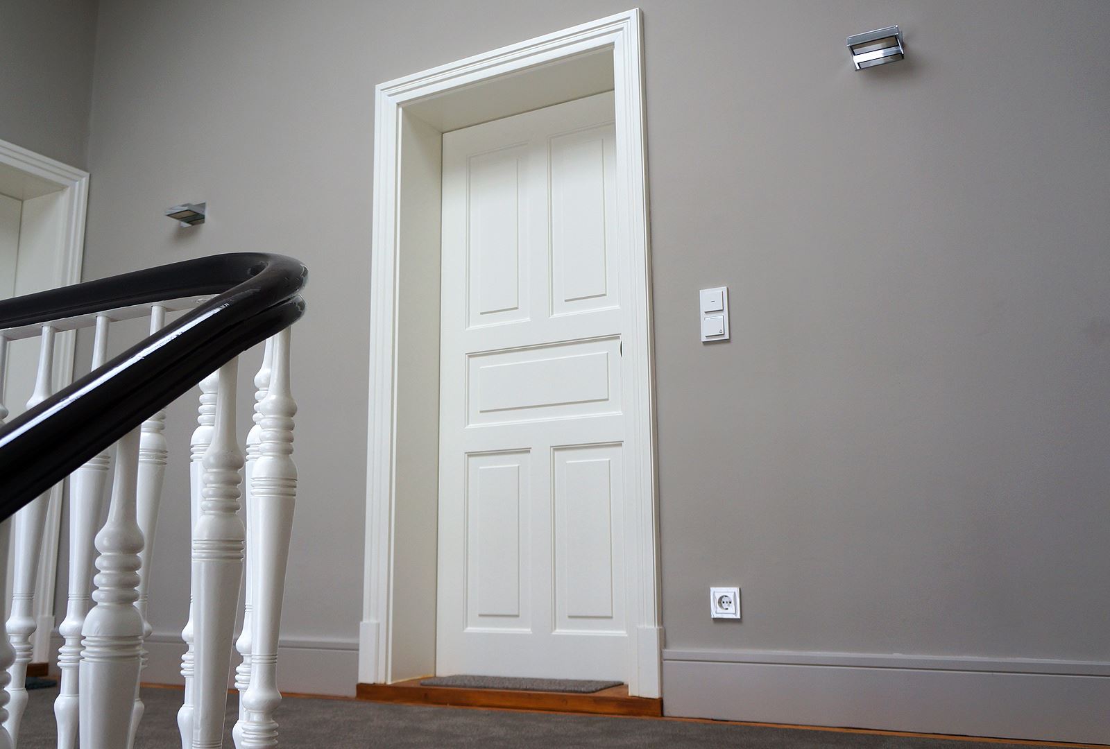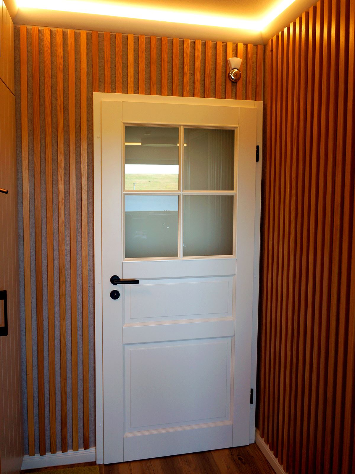 Bei Optik und Ausführung von Zimmertüren gibt es größeren Spielraum. Wer Privatheit wertschätzt, mag massive Türen. Hier sind Zierleisten ein schönes Gestaltungselement. Wo Gesellschaft und Gemütlichkeit zählen, sorgen Innentüren mit Lichtausschnitten für ein offeneres Bild des Raumes. Oder wie wäre es mit einer Schiebetür für clevere Raumausnutzung? Haben Sie schon mal darüber nachgedacht, den Flurspiegel in eine Tür einbauen zu lassen?